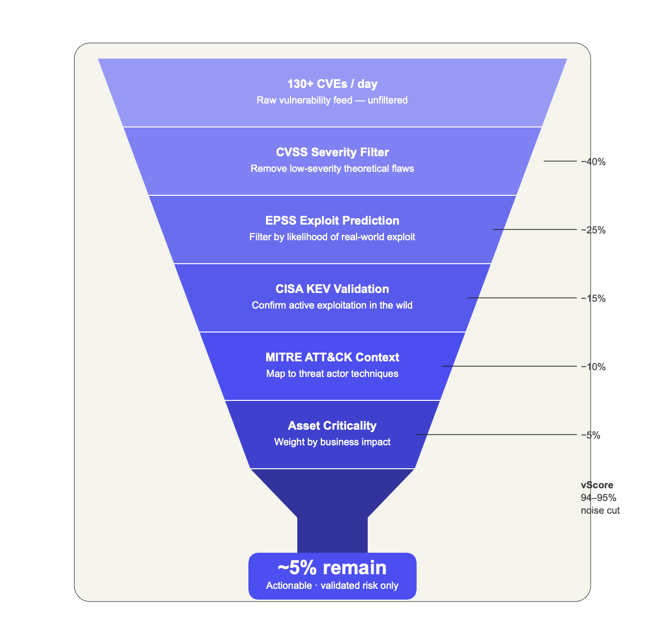 This kind of contextual risk scoring can reduce the actionable vulnerability set by 94–95%, cutting through the noise to surface vulnerabilities that genuinely warrant immediate attention.