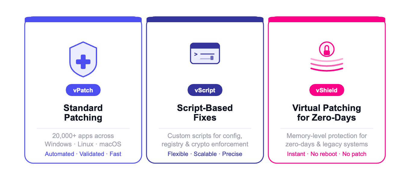- Coverage for every vulnerability type: patching, scripted fixes, and virtual patching for zero-days and legacy systems