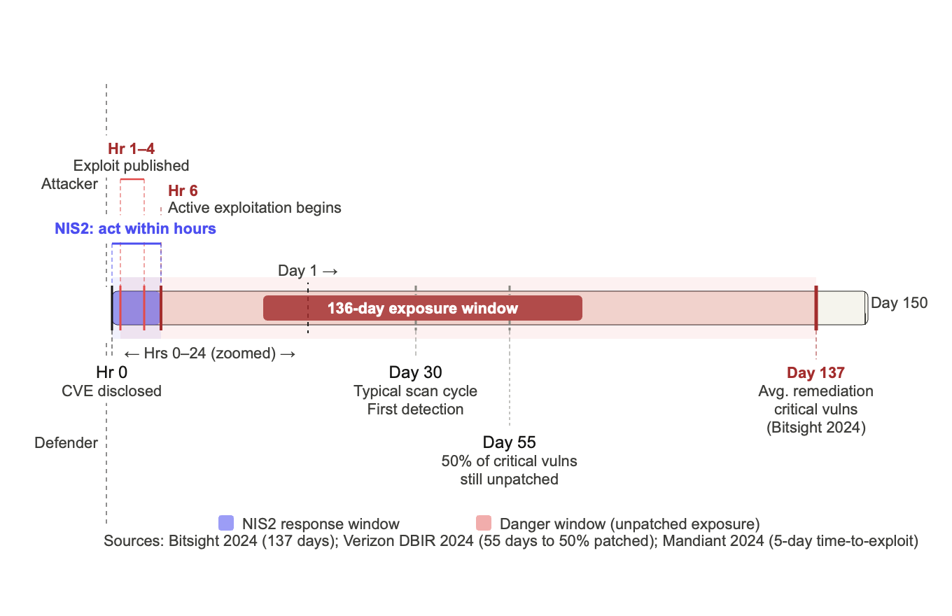 Most organizations run vulnerability scans monthly. Attackers exploit disclosed vulnerabilities within hours. That gap days or weeks of exposure between discovery and remediation is exactly what NIS2’s incident handling and risk management obligations are designed to close. Monthly scanning cycles cannot produce the continuous visibility Article 21(2)(a) demands.