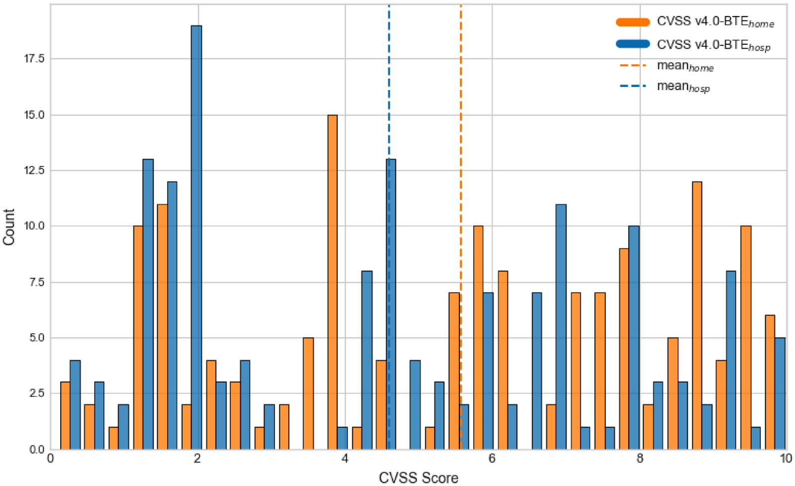 Distribution of CVSS 4.0 BTE scores computed under the two environmental profiles: “Hospital” (located at business premises, protected from greater internet by other infrastructure) and “home” (typical consumer-grade cyber protection only). (Source: ResearchGate)